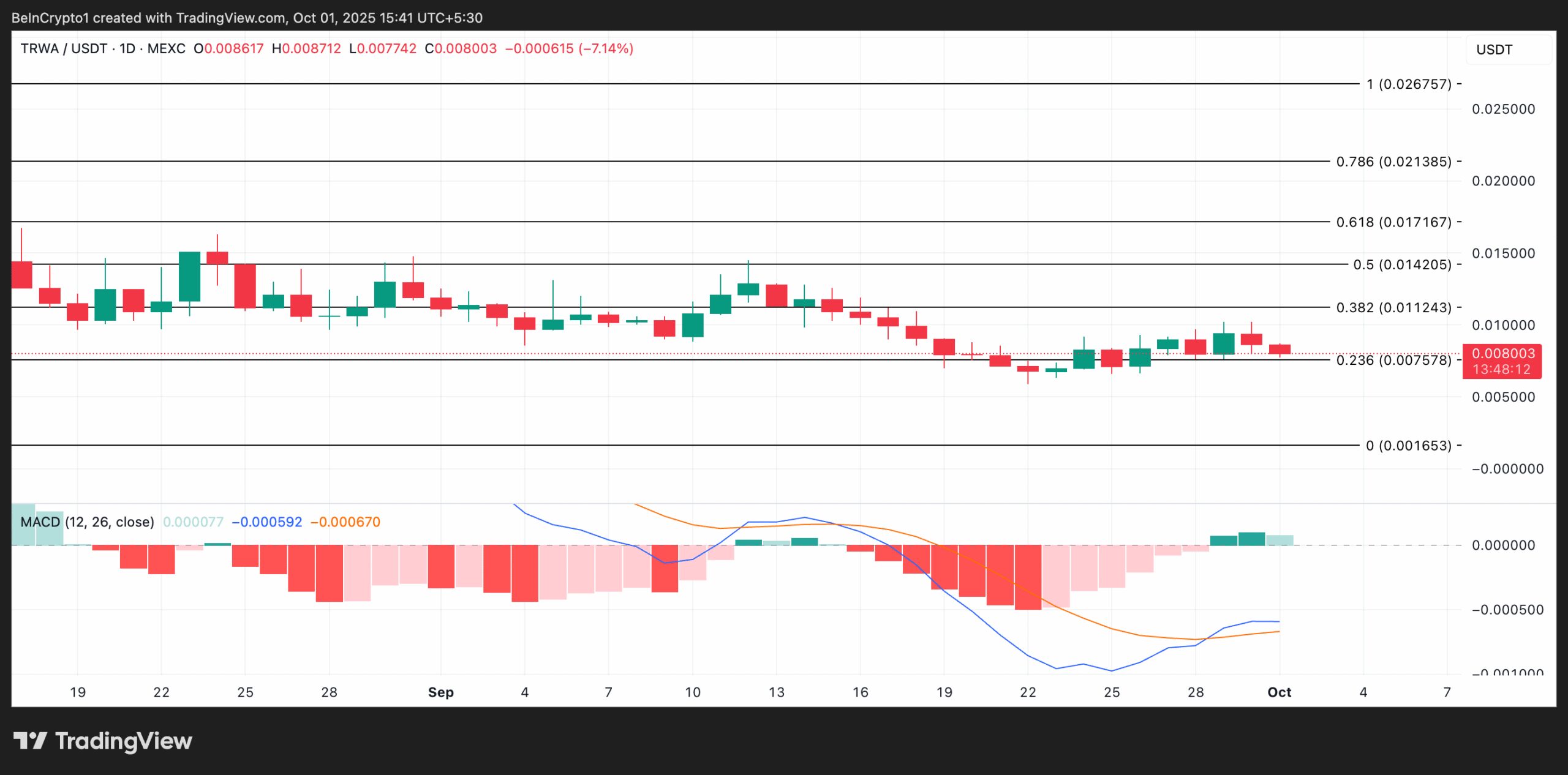 However, if the bulls lose their conviction and demand stalls, TRWA’s price could breach support at $0.00757 and fall to $0.00165.