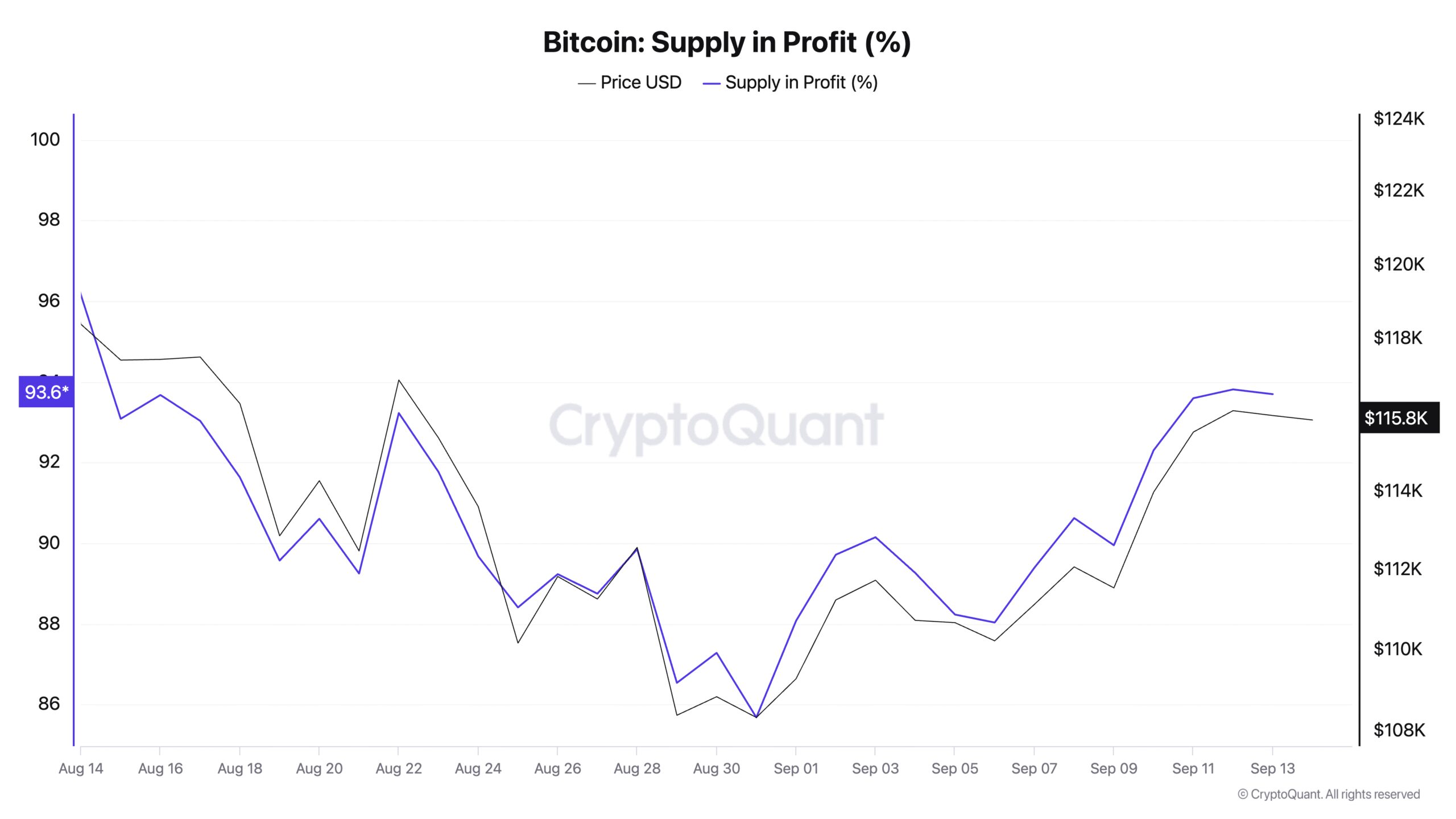 Further strengthening the bullish outlook, data from CryptoQuant reveals that 93.6% of Bitcoin’s circulating supply is currently in profit, a trend that has historically been followed by strong bullish phases.