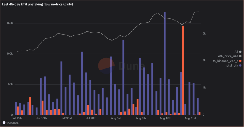 Unstaking does not automatically mean selling. Many holders may keep their ETH, waiting for higher prices or DeFi opportunities. Data from Dune Analytics indicates no strong link between unstaking volume and ETH price over the past 45 days.