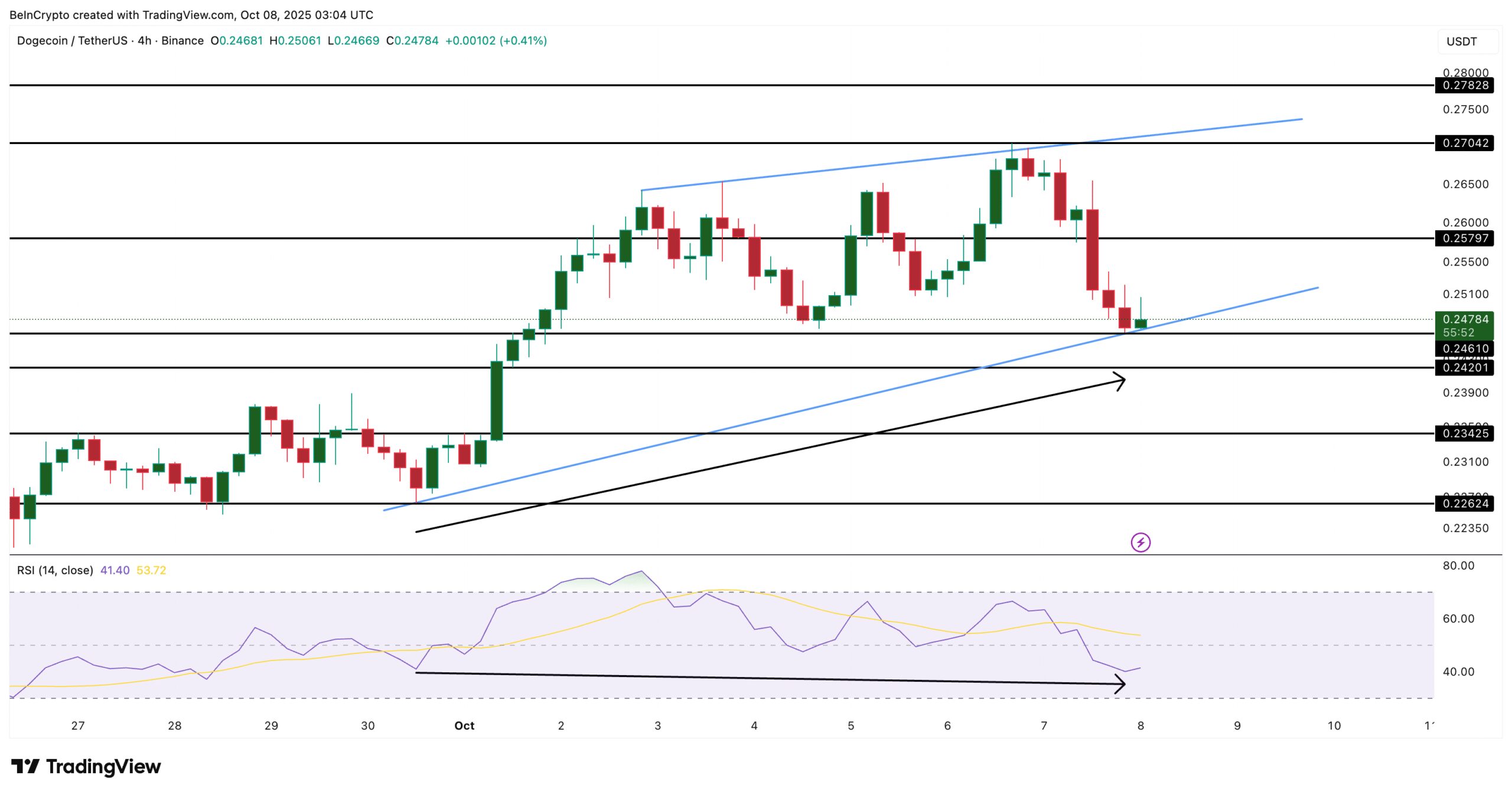 Dogecoin’s 4-hour chart shows the price respecting an ascending support line inside a rising wedge pattern. The recent bounce from $0.246 suggests buyers are defending that trendline.
