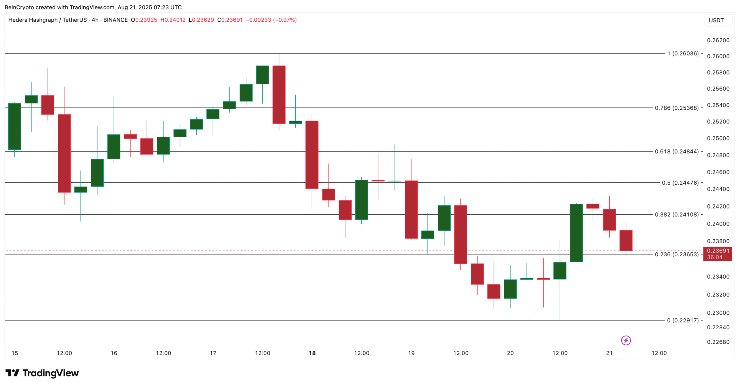 On the 4-hour timeframe, the HBAR price is hovering near a tight range between $0.236 and $0.241. The token has struggled to hold above this zone.
