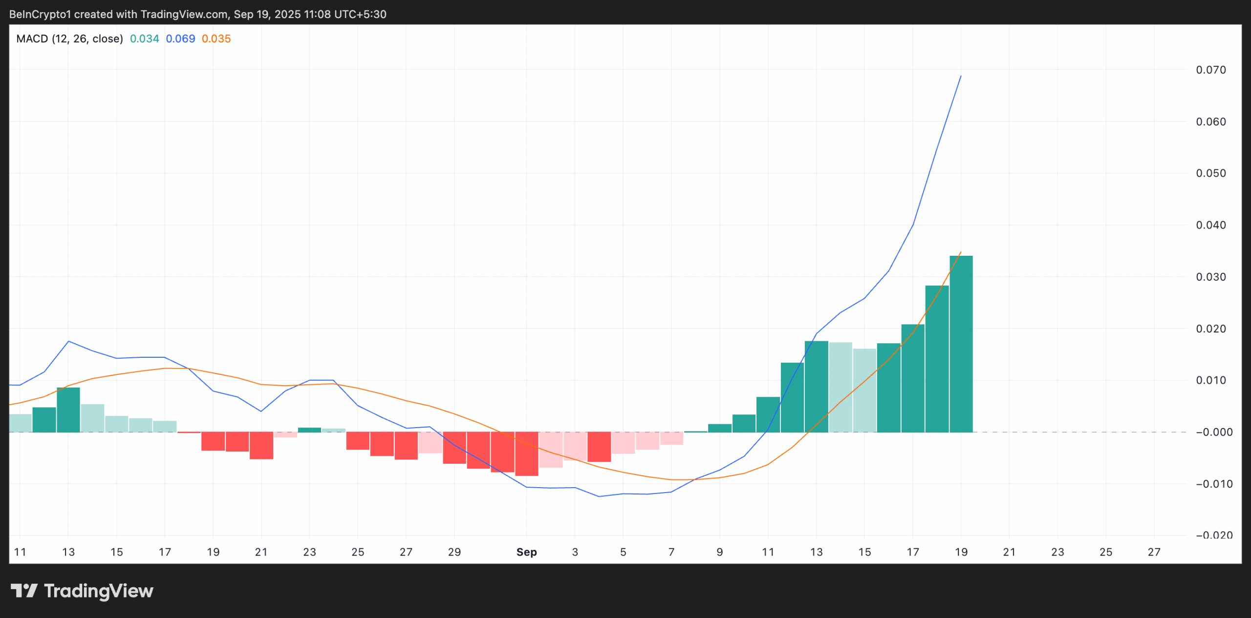 As with IMX, when the MACD line rests above the signal line, it signals growing buy-side strength and hints at the continuation of the current rally.