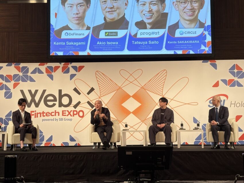 Participants included Akio Isowa of Sumitomo Mitsui Financial Group, Tatsuya Saito, CEO of Progmat, and Kenta Sakakibara, Circle’s Japan Manager, moderated by Kenta Sakagami, COO/CFO of DeFimans.
