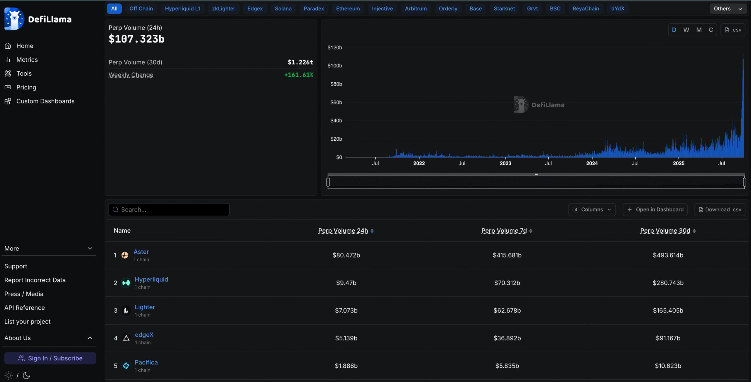 According to DefiLlama, monthly trading volume on perpetual DEXs surpassed $1 trillion for the first time in September. It reached $1.143 trillion, nearly a 50% increase from the prior month.