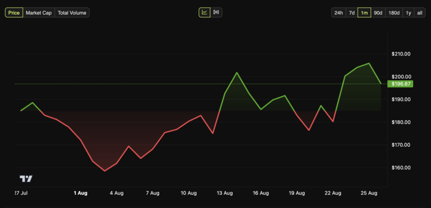 Solana’s native token traded at $187-189 on Tuesday, down 10-11% in 24 hours after briefly topping $212 over the weekend. Despite the dip, SOL remains one of the most institutionally supported assets, with Visa testing its blockchain to speed global credit card settlements. The token’s all-time high of $293 was reached in January.