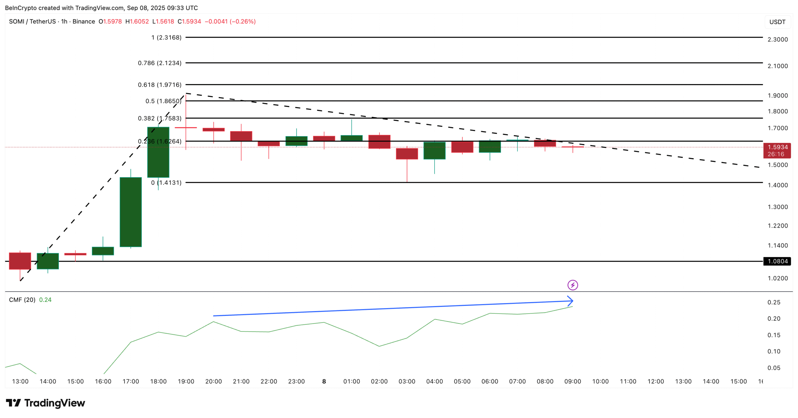Steady inflows highlighted on the 1-hour chart confirm this price map. The Chaikin Money Flow (CMF) tracks whether money is entering or leaving a token. As long as CMF stays above zero, it shows that money is flowing in. Even during the correction from $1.84 to $1.59, the CMF continued to move higher. That means large wallets continued to buy during the dip, keeping demand alive.