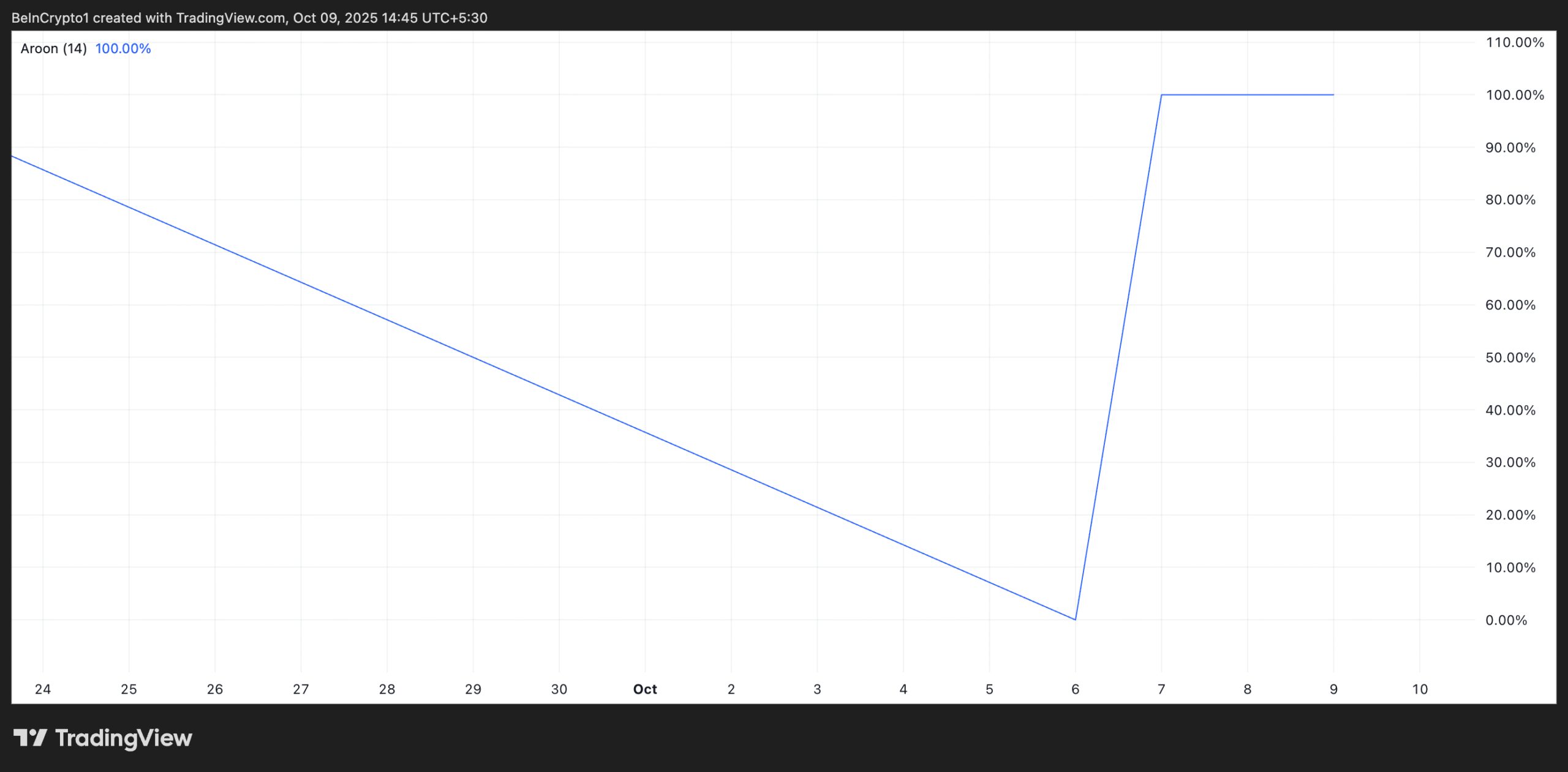 When the Aroon Down Line reaches 100%, the asset has recently made a new low within the chosen period, indicating a strong downward trend.