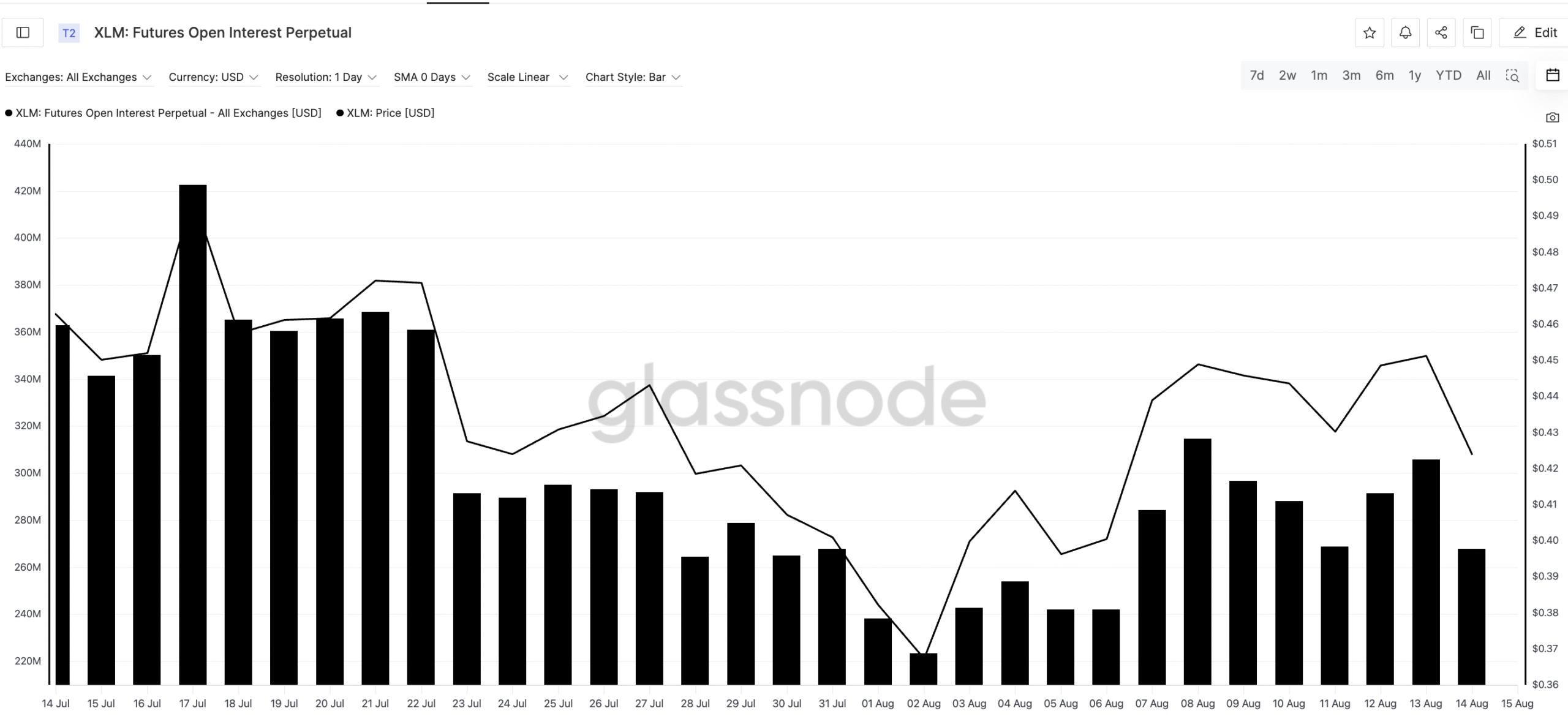 XLM price and dropping Open Interest: Glassnode