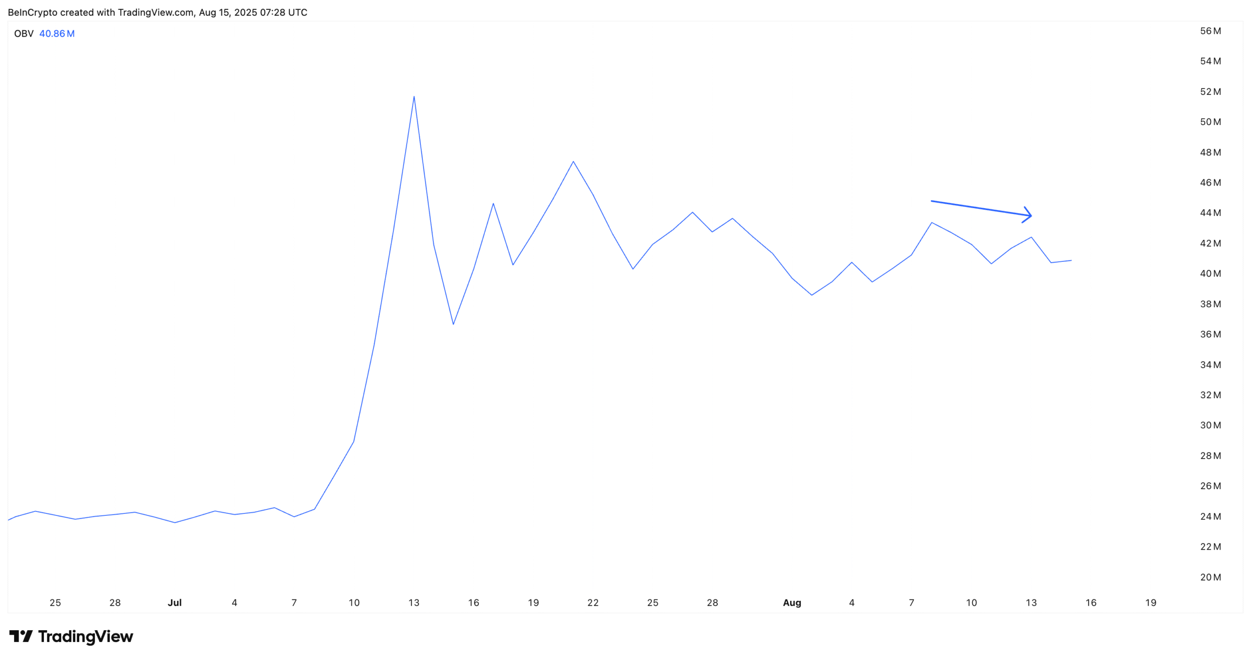 The first red flag is in market participation. While the XLM price made a higher high on the price chart (between August 8 and August 13), On-Balance Volume (OBV) printed a lower high. This suggests that spot buying interest is not following the same momentum. This divergence indicates that rallies have been met with lighter buying pressure, limiting sustainability.