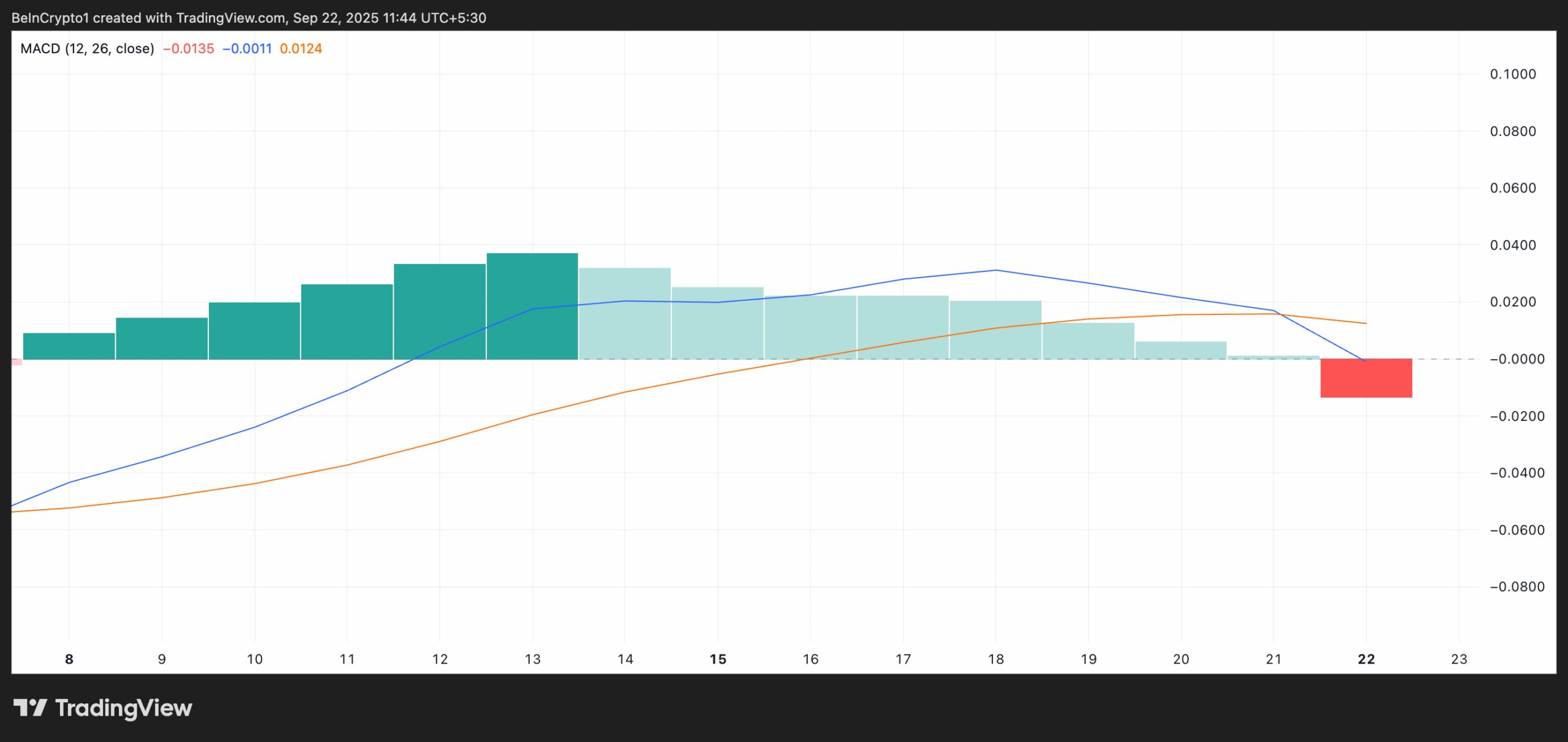 For XRP, this is the first time the MACD has taken this shape since September 8, highlighting a shift in market sentiment from bullish to bearish.