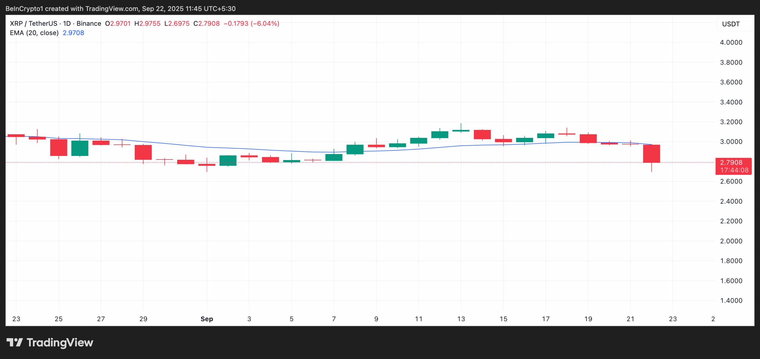 As of this writing, the key moving average forms dynamic resistance above XRP’s price at $2.97, keeping its performance muted.